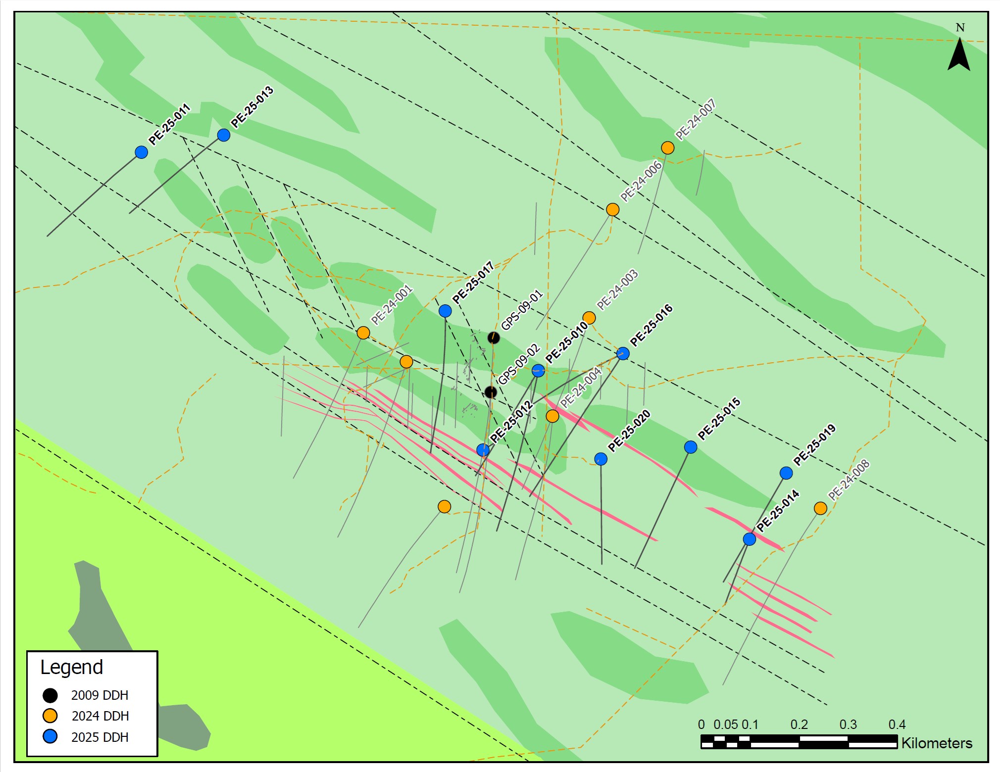 To the northwest along the mineralized corridor, PE-25-013 intersected 1.30 m @ 46.39 g/t Au from 29.70 m, located approximately 750 m northwest of GPS-09-01 and GPS-09-02.